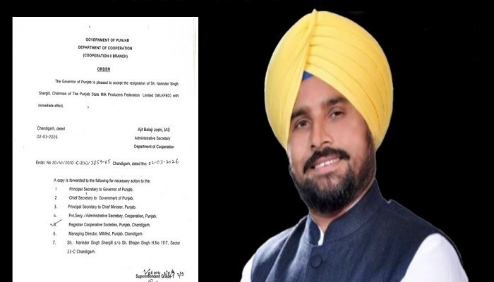 ਮਿਲਕ ਫੈੱਡ ਦੇ ਚੇਅਰਮੈਨ ਨਰਿੰਦਰ ਸ਼ੇਰਗਿੱਲ ਨੇ ਦਿੱਤਾ ਅਸਤੀਫ਼ਾ, ਤੁਰੰਤ ਪ੍ਰਭਾਵ ਨਾਲ ਮਨਜ਼ੂਰ